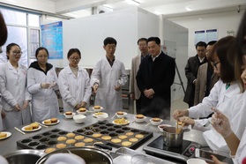 首先,校长来到食品实验楼,听取了庞勇老师的2015级食品科学与工程专业《食品工艺实验课》,并与师生亲切交流。校长品尝了同学们制作的蛋糕、薯条、番茄酱,教导同学们不但要从传统的工艺和配方上掌握食品的制作要领,更要在理论上学懂,学通,既要知其然,更要知其所以然。只有强大的理论支撑,才能更好推动工艺的改进,配方的创新。校长广博的知识令学生佩服,语重心长的教导让学生备受感动,同学们非常激动,纷纷表示:在大学期间能够当面聆听到校长教诲并和校长进行交流,万分荣幸,收获颇多,终身难忘。最后在同学们的热烈邀请下,李元元校长高兴地与同学们合影留念。