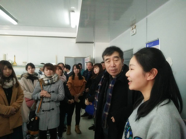 院长张铁华教授首先从办学历史、教学平台以及师资力量等方面介绍了学院的总体情况。随后,于亚莉教授与孙春燕教授分别从科研环境、研究方向及国际交流合作等方面对学院各实验室、工艺大厅进行了介绍,并带领交流团一行进行参观。在逐层走过学院实验室的过程中,各实验室的研究生也同日本师生进行了交流和互动,介绍相关科研领域,展示实验样品,阐述实验手段,并就双方感兴趣的话题进行了深入讨论。工艺大厅中,装备齐全的食品加工设备引起了交流团师生的极大兴趣与关注,学院将实验酸奶等分享给师生们品尝,寓教于乐,获得了一致好评。