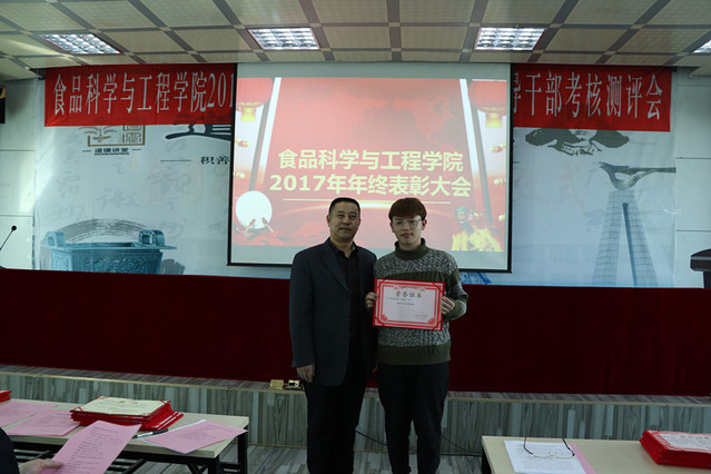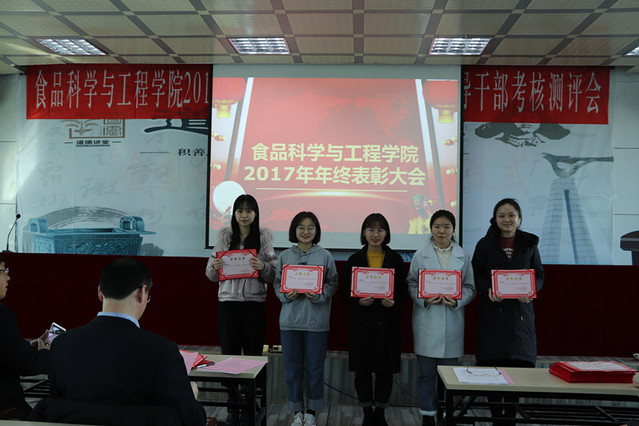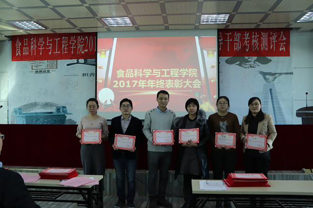 消防先进单位、个人表彰决定”、庄红副院长宣读“食品科技青年论坛获奖情况的通报”、周亚军副院长宣读了“关于2017年本科生学术年会获奖情况和优秀学生奖励的通报”。大会对一年来表现突出的单位、教师和学生进行了表彰。