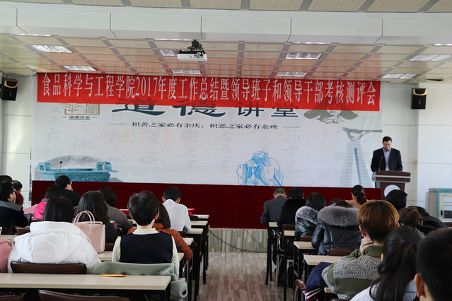 2018年3月16日下午,食品科学与工程学院在管理楼三楼报告厅召开了2017年度工作总结表彰大会暨处级领导班子和领导干部年度述职测评会。学院全体教职工和部分学生代表参加了此次会议。会议由院长张铁华同志主持。