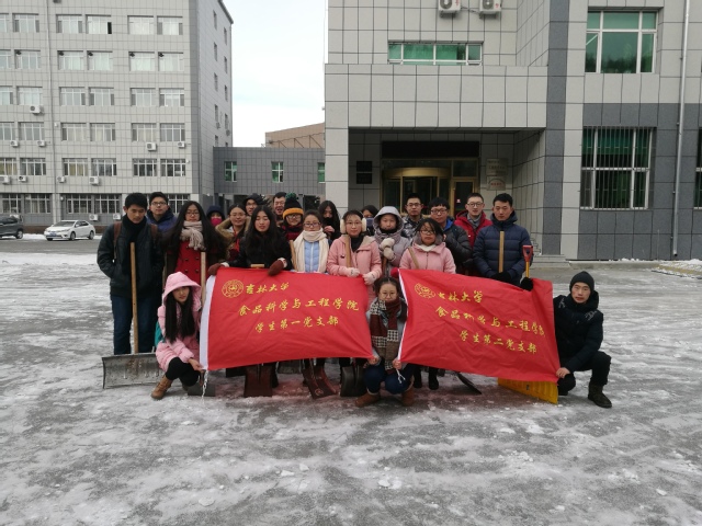 学生党支部组织支部内全体党员于食品楼前开展扫雪活动。