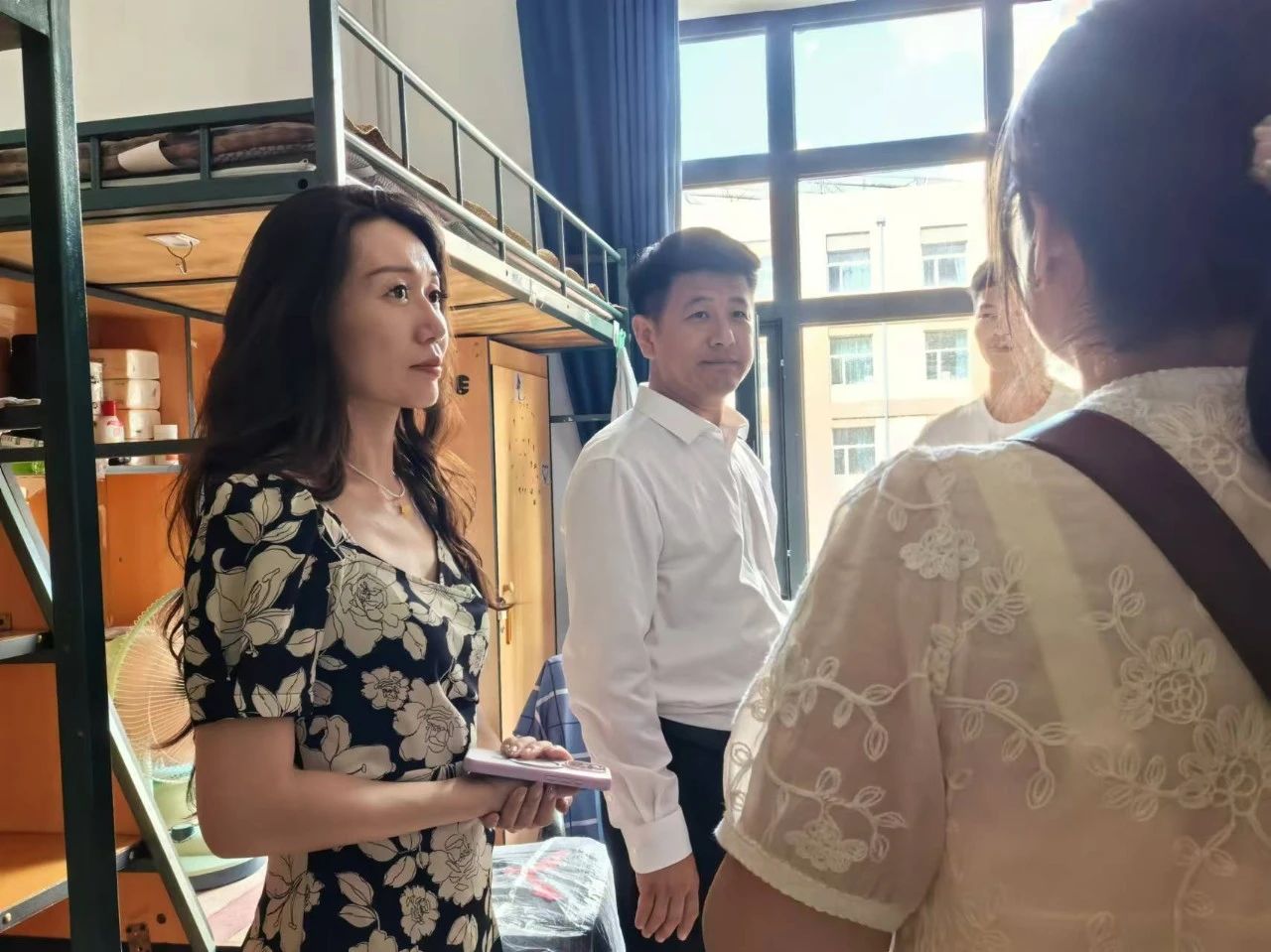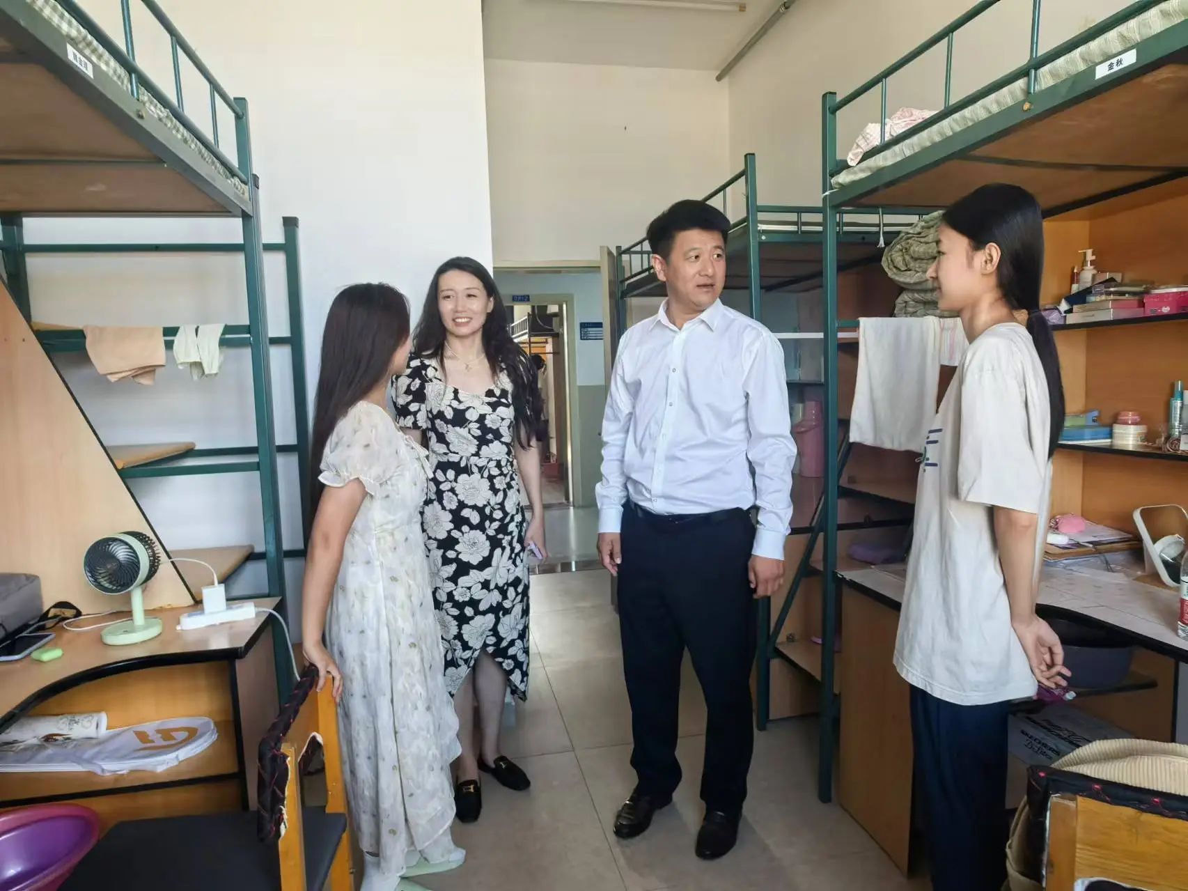 李超副书记和王新欣老师逐一走访各个新生宿舍,亲切地与同学们交流,询问他们对新环境的适应情况。每走进一个宿舍,书记和辅导员老师都会细心查看宿舍的设施设备是否完好,提醒同学们注意用电安全、财产安全等。同时,辅导员王新欣老师为新生们答疑解惑,解答同学们对于学习和生活上的疑问,同时也鼓励新生们要相互关心、相互帮助,建立良好的宿舍关系,共同营造一个和谐、温馨的氛围。
