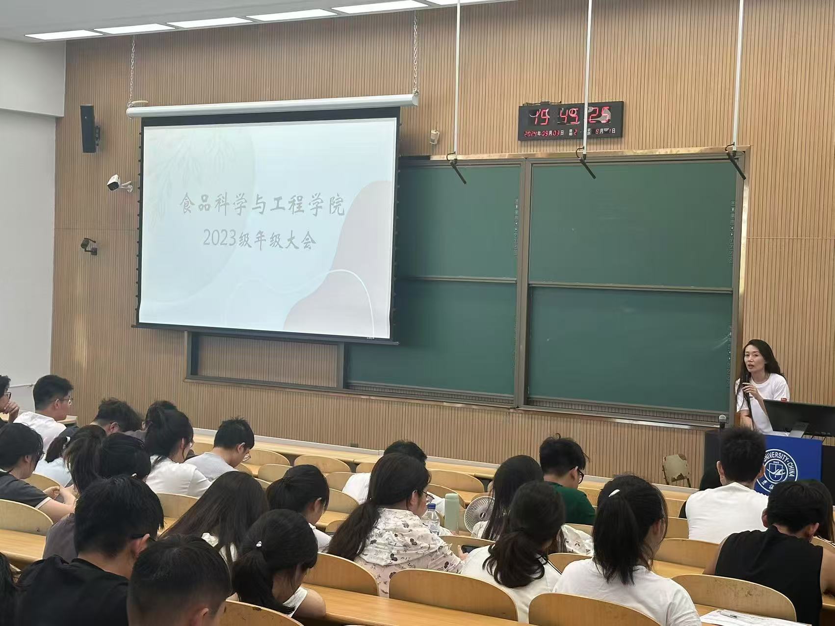 和平校区科学讲堂召开2023级年级大会。会议由2023级辅导员王新欣老师和研究生兼职辅导员王博旭老师主持,全体2023级学生参会。
