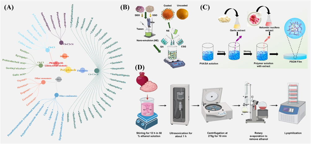 此外,成本是限制多酚-淀粉膜与涂层规模化应用的主要障碍,其成本甚至可能是传统塑料的10–50倍。尽管在早期探索阶段成本较高可接受,但其最终成本应控制在食品整体成本的10%以内。当前高成本主要源于生产工艺及多酚原料,而非淀粉本身。通过优化工艺参数与引入热机械技术可有效降低生产成本。值得注意的是,一些研究采用纯多酚单体(如没食子酸)制膜,价格昂贵,不利于商业化推广,因此,建立高效、绿色的多酚工业提取体系是推动该类活性包装产业化的首要任务。尽管超声辅助提取(UAE)与超临界流体提取(SFE)初期投资较高,但长期来看可减少能耗与有害化学品使用,具有环境与经济优势。例如,使用UAE提取洛神花多酚可使碳排放减少31%。因此,应推动大型提取设备研发及参数优化,鼓励面向应用的大规模多酚提取与利用研究。