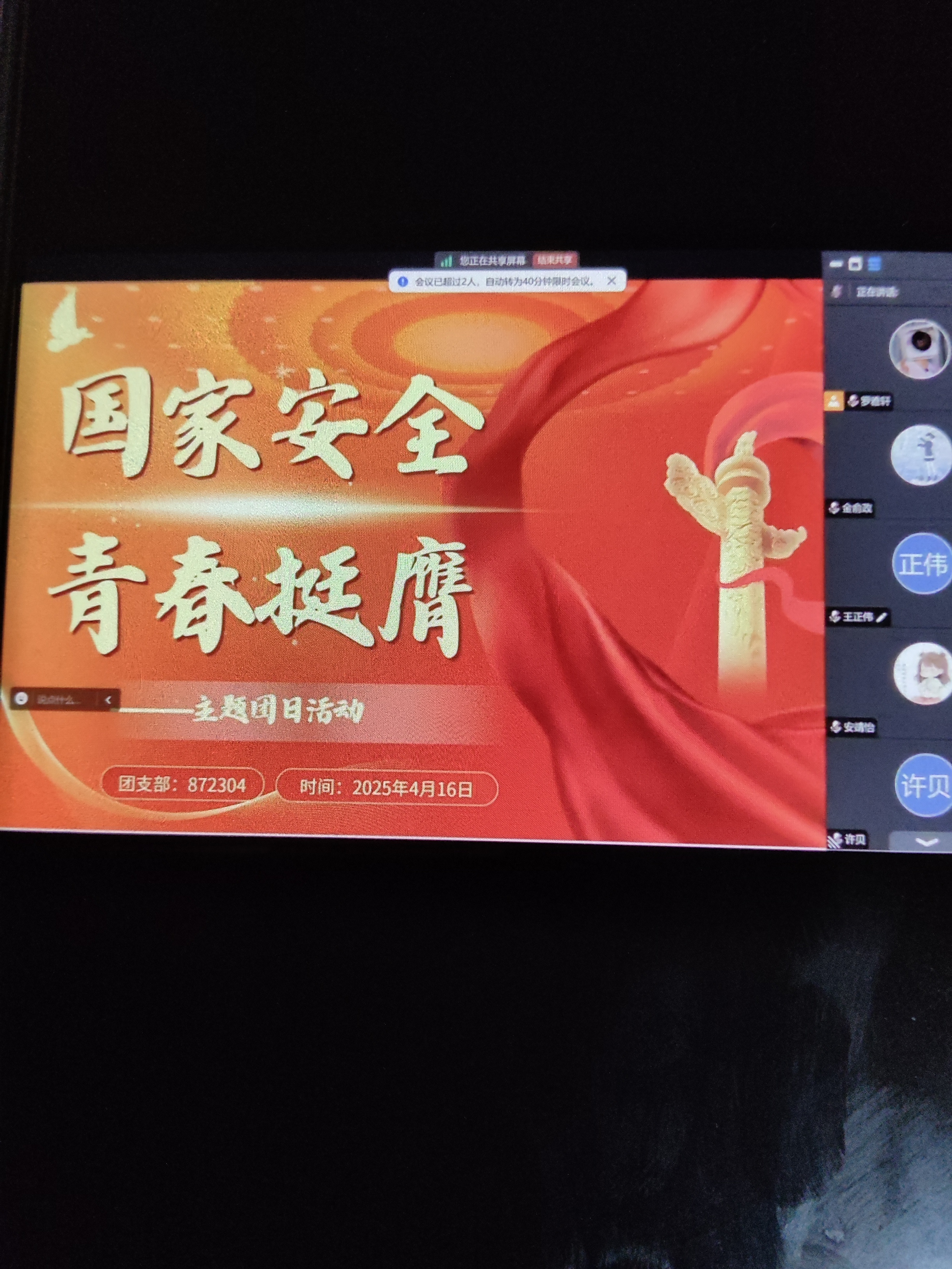 2025年4月16日,2023级4班全体共青团员通过腾讯会议开展了主题团日活动。通过知识讲解、观看宣传片等多种形式,同学们深刻认识到了维护国家安全的重要性,将 “国家安全,青春有责” 的使命感转化为实践动力。同学们纷纷表示,在今后的学习和生活中,会时刻牢记维护国家安全的责任,从自身做起,从小事做起,积极传播国家安全知识,为维护国家安全贡献自己的青春智慧和力量。