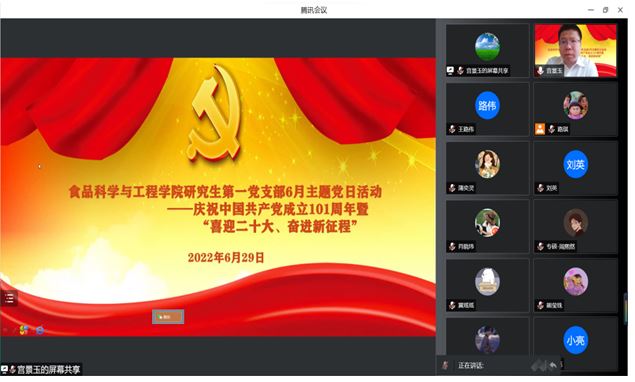 研究生第一党支部于2022年6月29日下午,通过腾讯会议线上召开6月主题党日活动。支部全体党员参加,会议由副书记刘祎主持。
