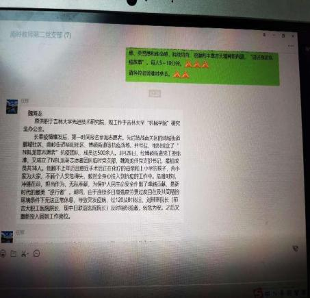 活动中每位党员表示:通过参加学校和学院组织的《黄大年》观影,《黄大年》话剧、学习“黄大年精神的档案记忆”等纪念习近平总书记对黄大年年纪事迹做出重要指示五周年活动,深受黄大年老师精神所感动;在长春面对“疫情”严峻情况下,被战斗在抗疫一线的“显形志愿者”如医务工作“大白”、各界的志愿者“小白”们的行为所感动,同时也被看不见的背后的“隐形志愿者”如身边的老师、学生、家人和邻居,他们的默默付出,也是值得敬佩和学习的。如任辉老师分享的沈先生