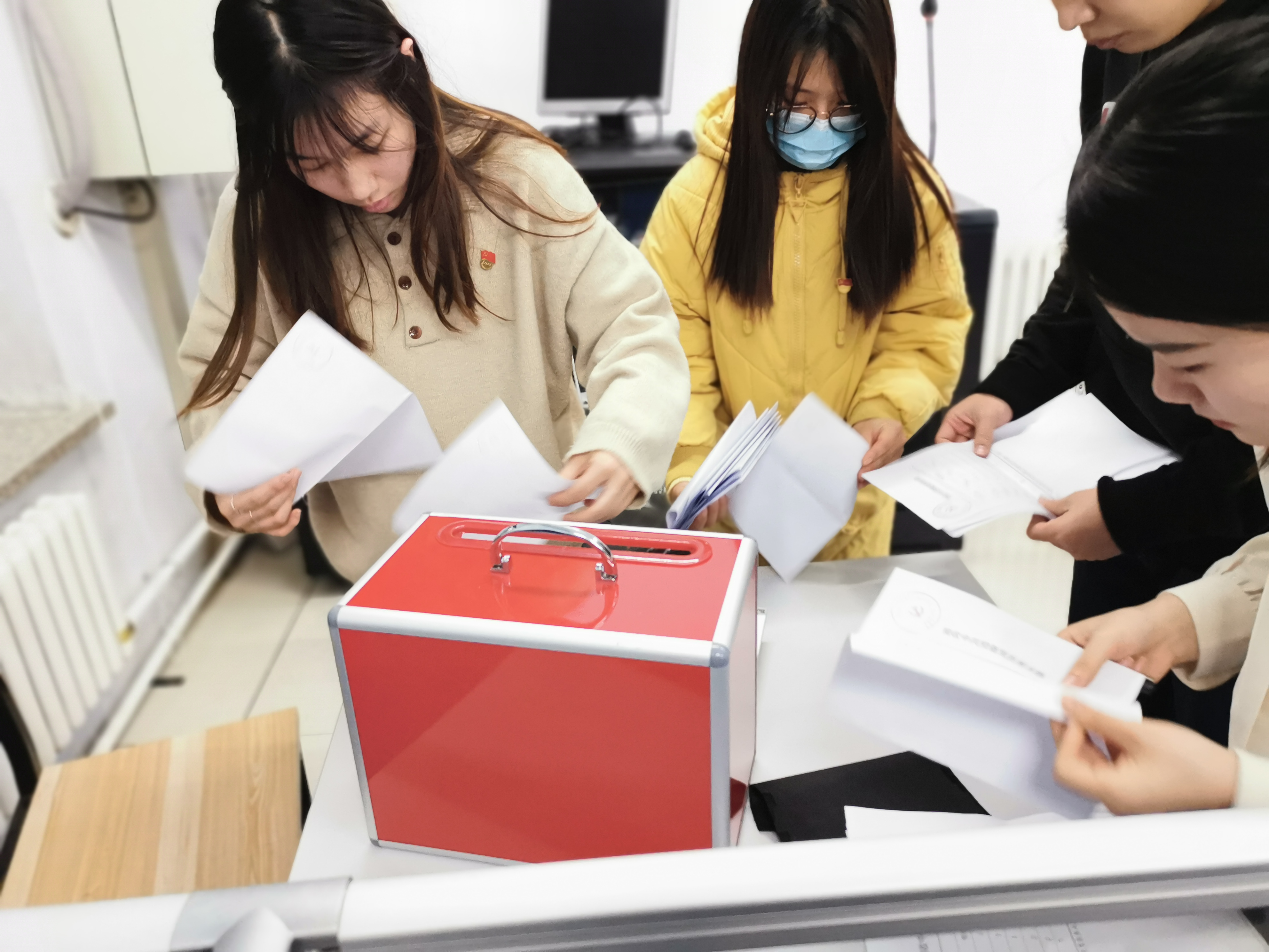 紧接着,由支部副书记刘祎主持第二项议程,根据党支部发展党员工作计划,经征求党小组和党员、群众意见,支部委员会审查同意,讨论和表决接受陈美如等六名发展对象为预备党员。首先,严格按照接受预备党员程序:每名发展对象本人汇报预备期间的思想、工作情况;每名发展对象的两位培养人分别介绍该同志在成为入党积极分子以来的学习情况和意见;组织委员迟坤梅代表支部委员会报告每名发展对象的审查意见;与会党员发表意见,对每名发展对象能否接受为预备党员进行充分讨论;接着全体党员举手表决通过监票人名单:纪检委员蒲奕灵、刘泽亿同志;指定计票人名单:宣传委员李晨飞、王路伟同志;最后,对发展对象陈美如等六名同志进行无记名投票表决并统计票数现场宣布,同意接受六名同志为预备党员的赞成票超过应到会正式党员的半数。