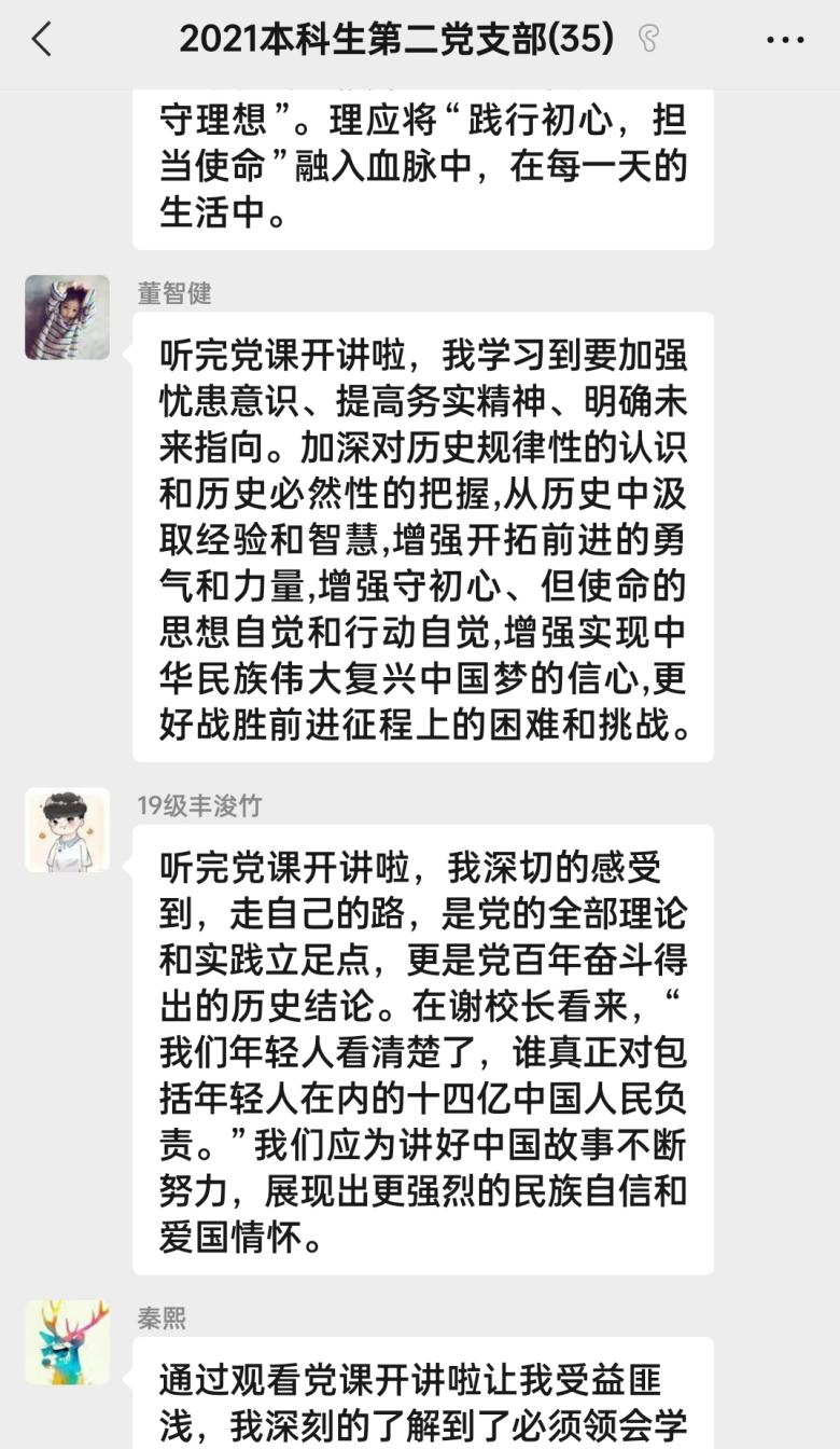 视频观看完毕后,与会同志进行交流讨论。支部党员周洪江表示,不明史,不知过往,今后将牢记党的宗旨,提高党性修养,以实际行动,真正发挥学生党员的先锋模范作用,增强身为党员的使命感和责任感。预备党员夏婉婷同志说,谢老师掷地有声的那句话,“一百年来,我们党回答了很多问题,为中国人民谋幸福、为中华民族谋复兴,从来没变过!”让她印象深刻,中国共产党始终同人民想在一起、干在一起,风雨同舟、同甘共苦,为实现人民对美好生活的向往不懈努力。方帅贞同志总结道,通过本次党课学习后,希望大家不忘自己的入党初心,坚定理想信念,肩负起新时代青年的使命与责任,以更昂扬的精神状态投入到工作中去,不负时代,不负韶华。在会后大家还在支部的微信群进行了热烈的讨论,交流本次党课学习的感想。