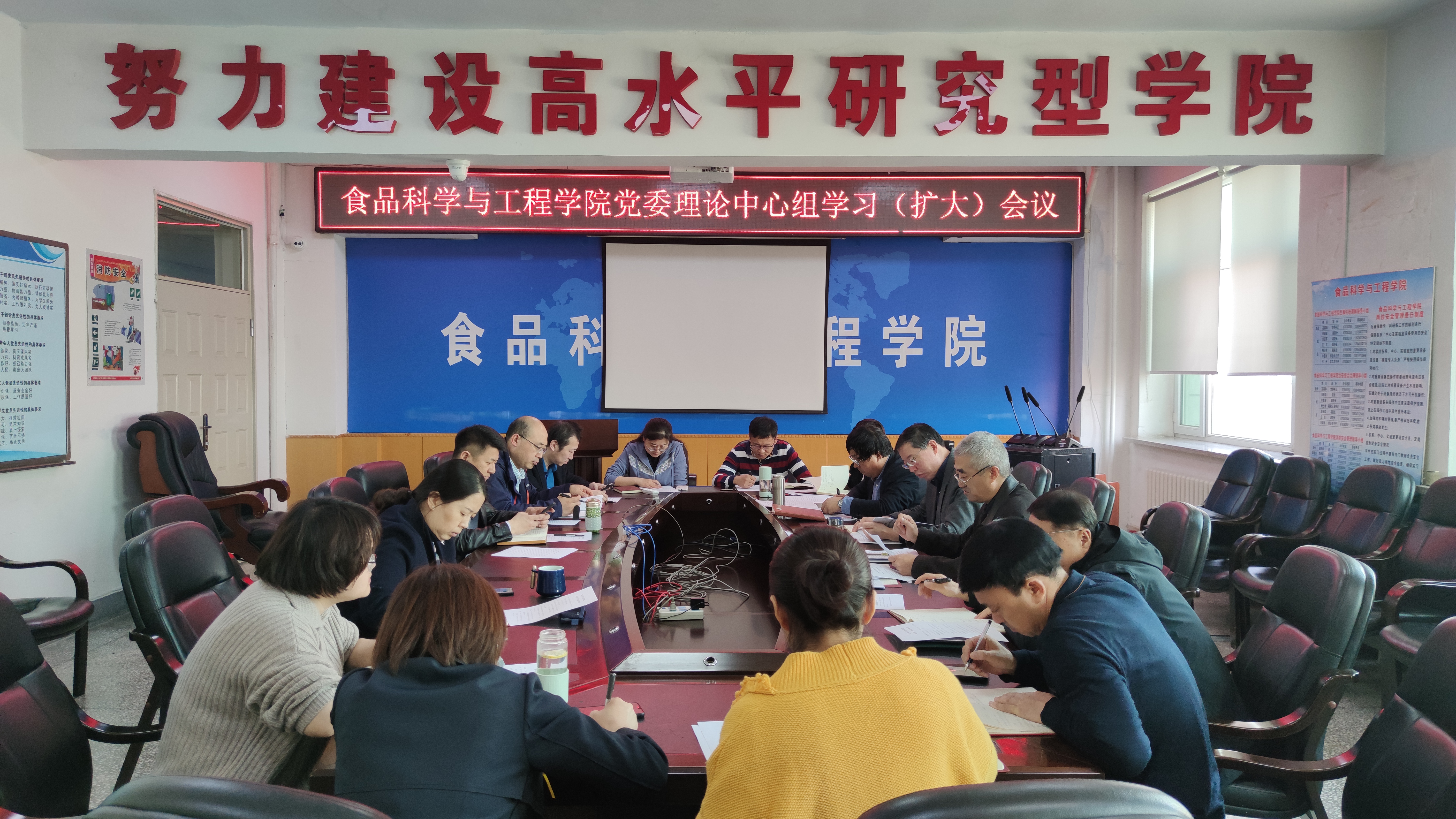 在食品楼三楼会议室召开党委理论中心组学习(扩大)会议。学院党政领导班子成员、院学术委员会主任委员、院学位评定委员会主席、院教学委员会主任委员、各办公室、系(中心)、教研室主任参加了会议。会议由学院党委书记董怀智主持。