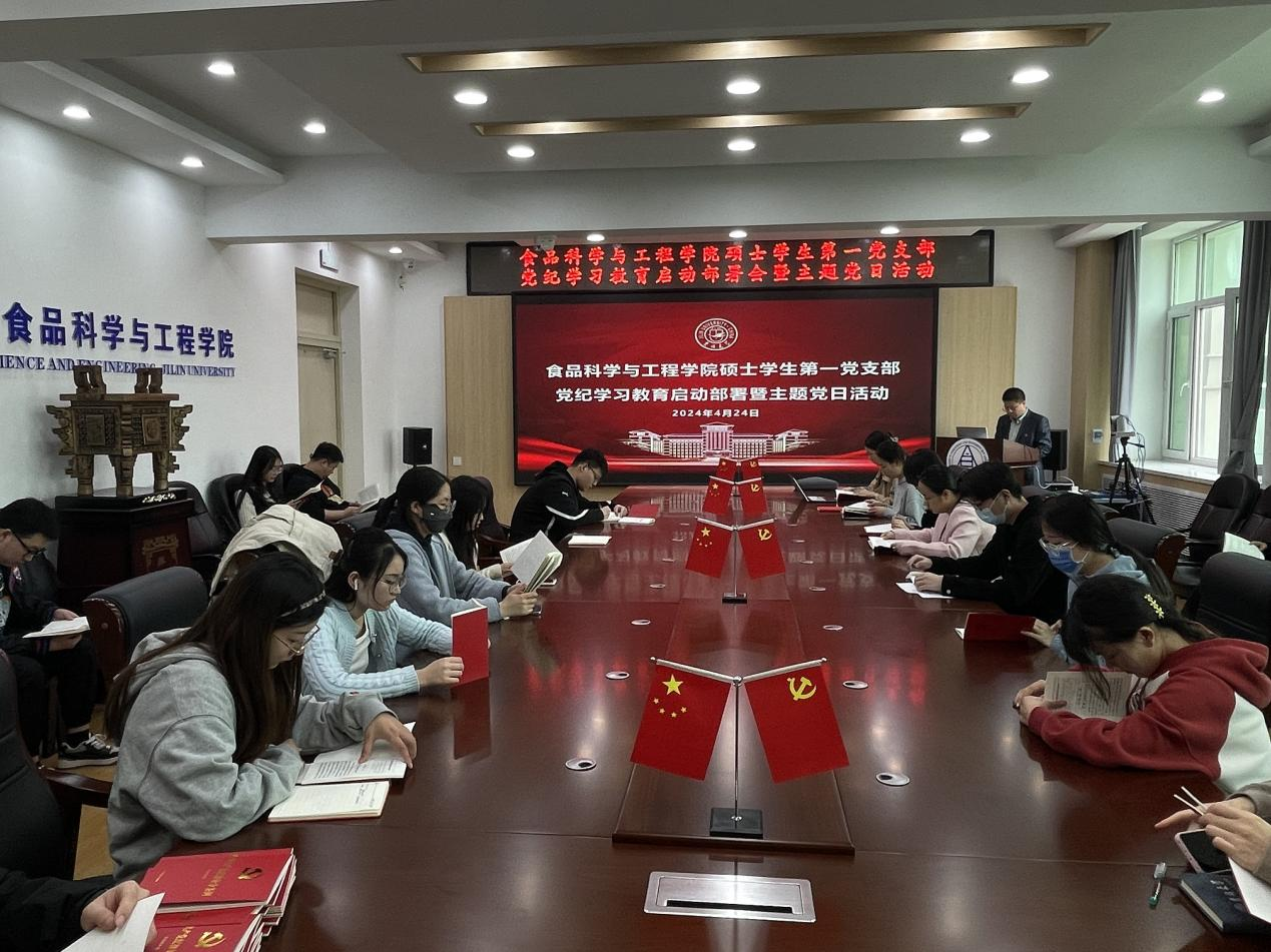 硕士学生第一党支部于4月24日在食品楼312会议室举行了党纪学习教育启动部署会暨4月主题党日活动。支部全体党员参加,会议由支部书记宫景玉主持。